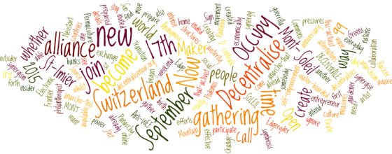 On the 17th of September 2015, the fourth anniversary of the birth of the Occupy movement, you are invited to come as you are to “the Mountain of the Sun” and join the first Decentralise Now gathering on Mont-Soleil, Switzerland. We need to synergise our efforts to become more effective in creating a new reality, a new world, a new way. It is time to “Occupy the World“ and create an alliance of the alternatives. This is a call for alliance! We do not sit idly by whilst we see countries being economically water-boarded by the banks. We cannot ignore the pressures on everyday people that these austerity measures have created. There is another way. We are prepared for a wave of synergism that decentralises the power structures. It is time to create a culture of self-empowerment, synergy and symbiosis between each other and nations. We are the people - we are the 99% Whether you already are a change maker or want to become one, whether you are Occupy, Anonymous, Transition, Maker, Greens, Pirate, Podemos, Permaculture, Rainbow, Hacker, Open Source, Electronic Frontier, Commons, New Edge, Edgeryder, Danach, Neustart, Anti-WEF, Panarchy, anarcho-this or anarcho-that, social entrepreneur, artist, philanthropist, guerrilla gardener, insider, outsider, this-activist or that-activist, or just somebody that is aware - this call for alliance is to you. It is time. Join us to Decentralise Now. In St-Imier, the home of anarchism... where it all began in 1872. We gather on the 17th of September to move ahead. The main event will be an intense collaboration and exchange that weekend, from Friday evening at 19:00 to Sunday at 17:00. This is an open ended gathering. We will continue beyond that weekend and you can join us at any time. You are also able to participate online, if you can’t join us at the Décentrale on Mont-Soleil, Switzerland. WHEN : SEPTEMBER 17TH, 2015 We intend to make this event prix-libre. We will need your financial support. Please expect to expend what you can afford to pay for such an event. If you can give more, please do. If you know people that might be able to make a financial contribution, please encourage them to do so. Sign up and find more details here on the website decentralisenow.org, as they become available. facebook.com/groups/decentralisenow ... Link (0 comments) ... Comment Thursday, November 13, 2014